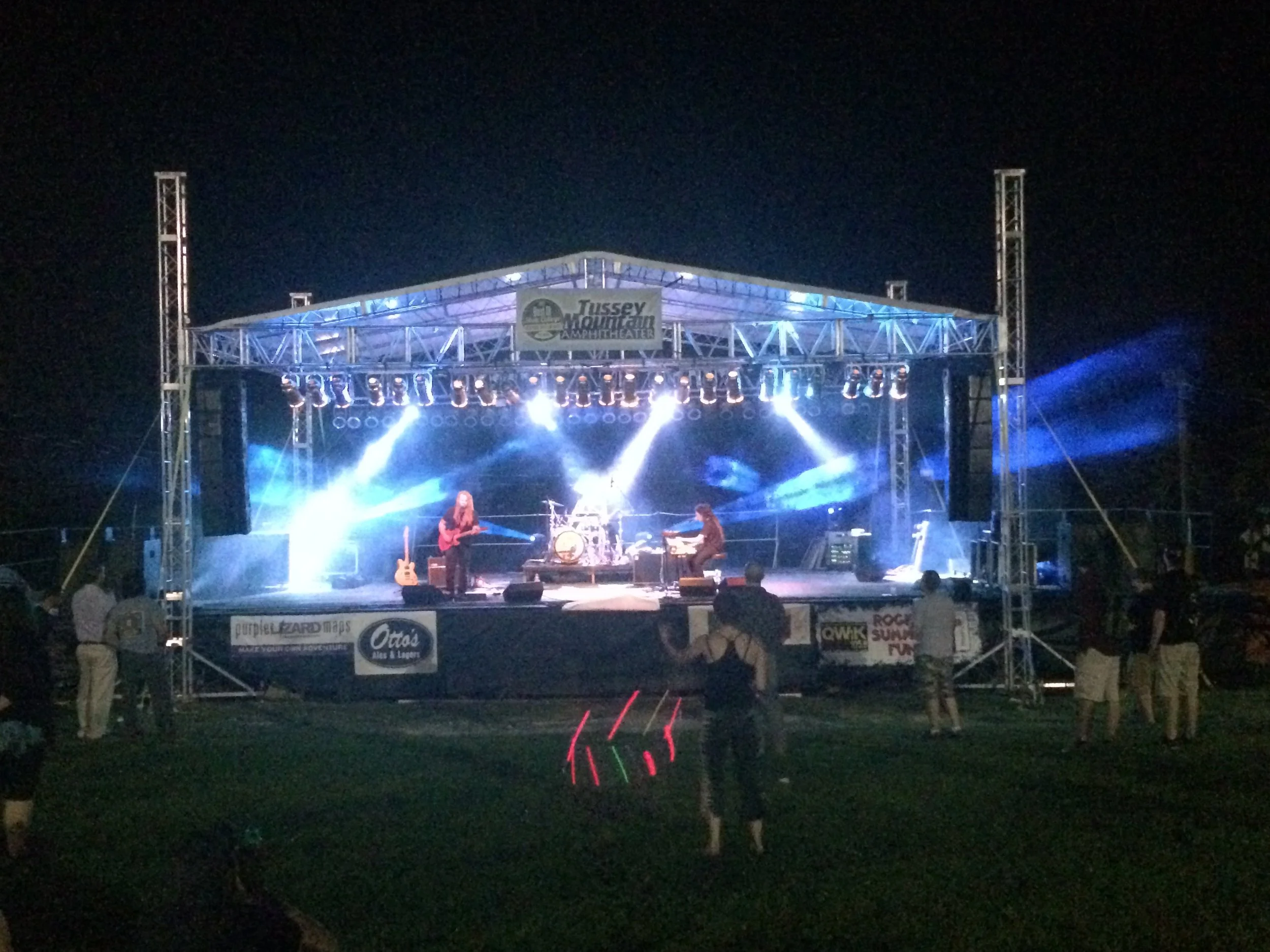 Empty outdoor stage with lighting and sound equipment at night, set up for a music event called Jazz & Blossoms Park Jam in downtown.