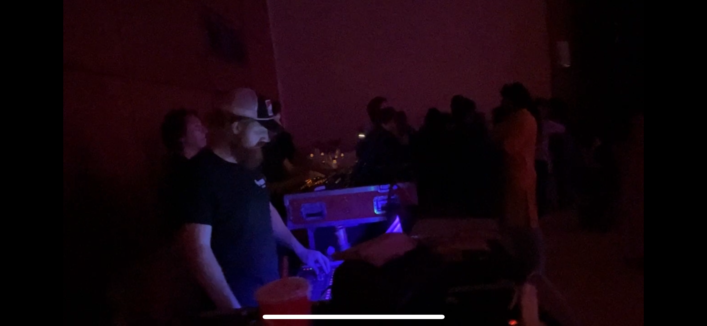 A night concert scene with a stage lit up with lights and smoke. In the foreground, a sound engineer operates multiple sound and lighting control panels and computers.
